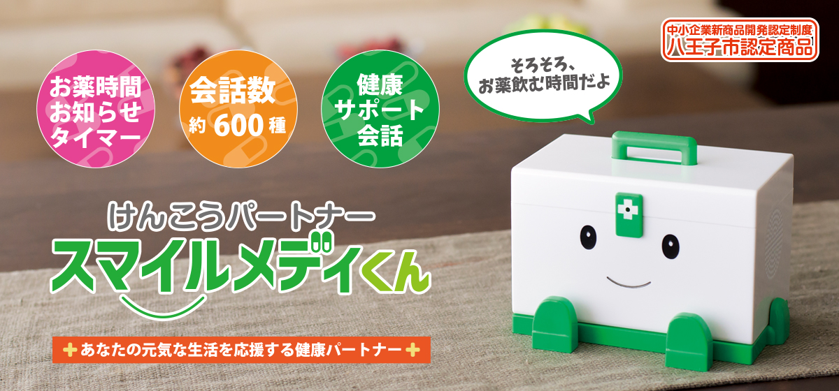 「けんこうパートナー スマイルメディくん」は平成29年度八王子市中小企業新商品開発認定制度で認定された商品です。